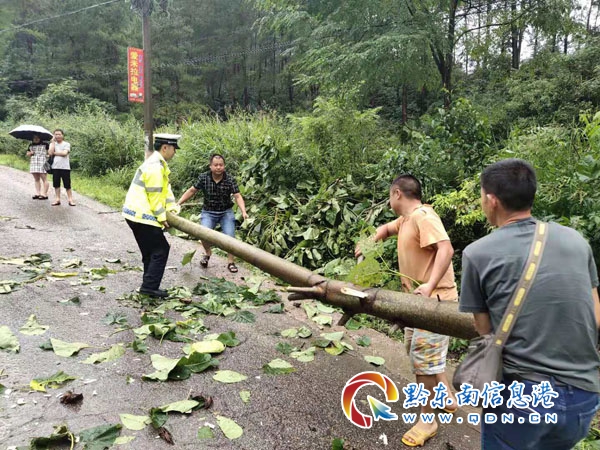本網訊 連日來,施秉縣轄區普降大到暴雨,為確保群眾出行安全,縣公安局交警大隊聯合縣交通局、農村公路管理局、市政局等投入大量人力、物力,強化路面嚴重積水、邊坡垮塌、倒塌物體等交通安全隱患排查、排除。2019年7月8日,大隊民警與公路局人員巡邏至凱施線75km處時,發現一顆直徑20余厘米的樹橫躺在道路上致交通中斷。見此情景,巡查人員立刻拿出備用工具,同過路群眾攜手第一時間將樹木移除路外,快速清除路障確保轄區道路交通安全、暢通。(曾云成 蔣倩)