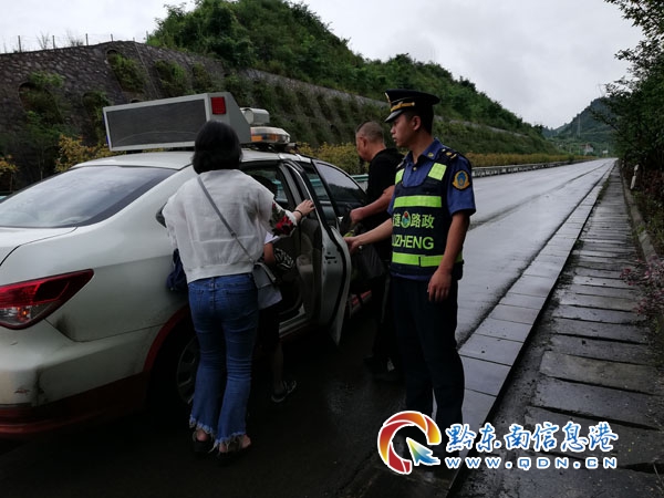 了解情況后,路政員立即分頭行動,一邊組織人員根據安全距離設置擺放安全錐、打開危險報警閃光燈,一邊組織滯留乘客退出高速公路站在警戒區內。因考慮到滯留人員較多,天又下著大雨,轉運車還要90余分鐘才能趕到,為保證安全,路政員果斷決定,采用執法車轉運的辦法,將滯留人員轉運至最近的收費站。現場已有兩輛執法車,還需要一輛才能把乘客全部帶離,于是,在轉運的同時,路政員又立即聯系兄弟單位施秉大隊增援,這才將剩余的滯留乘客一同轉運至施秉西收費站。20分鐘后,滯留乘客全部安全轉移,在安排好乘客們的休息場所之后,路政員又馬上驅車趕往客車拋錨現場,與應急拖車隊一同開展拖車救援,將該客車安全拖到施秉西收費站廣場等待維修。