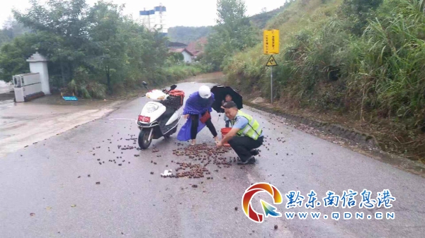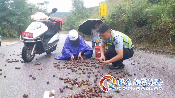據(jù)悉,駕駛?cè)她埬臣易?a href="http://www.dghzdr.com/html/news/CityNews/sb/" target="_blank" class="keylink">施秉縣城關(guān)鎮(zhèn)沙坪村,正從雙井鎮(zhèn)親戚家采摘脆紅李回來。車上又是框、又是桶,本想多帶點(diǎn)李子帶回家給家人、朋友品嘗。可來到事發(fā)路段時,由于雨較大,路面濕滑,車上水果較重,避讓車輛操作不慎,導(dǎo)致所駕駛的摩托車是去平衡側(cè)翻在路中間,帶來的水果瞬間灑滿路面。所幸,人員沒有受傷,才有民警見到的一幕。