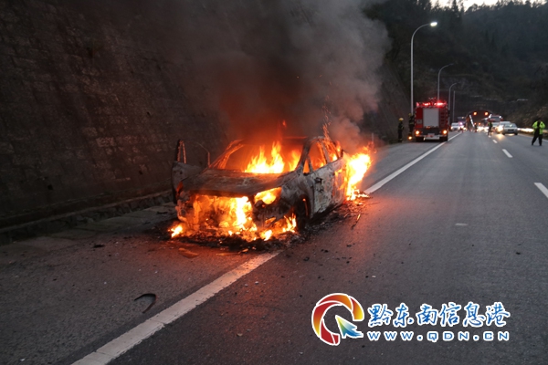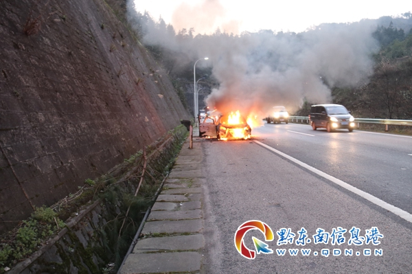 本網訊 3月11日下午6時許,滬昆高速凱里往臺江方向南約溝隧道出口處,一輛小車突然自燃,車體被燒后只剩下鐵架,幸好,司機及時逃離躲過一劫。