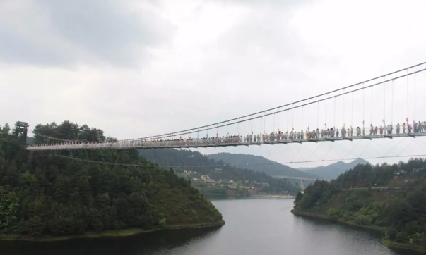 丹寨萬達小鎮玻璃棧橋名為“娜悠橋”,位于萬達小鎮景區內,上跨越丹寨東湖水庫,軸線呈西北-東南走向,是一座全透明玻璃橋面板的懸索橋,兼具景區游客行人、游覽觀光、T臺等功能。