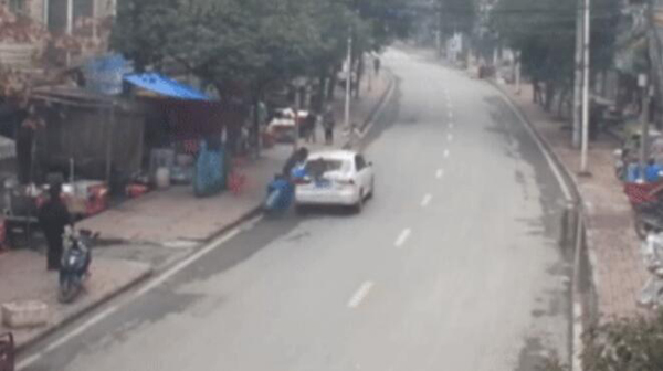 當天上午11點30分左右,在天柱縣城區白水路段,一名婦女推著燒烤車由南向北前行,突然一輛白色轎車對著她就撞了過來,將燒烤車推行了近五米才停了下來。