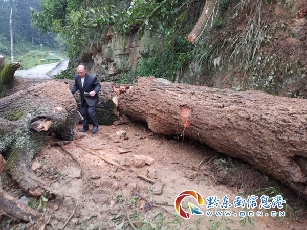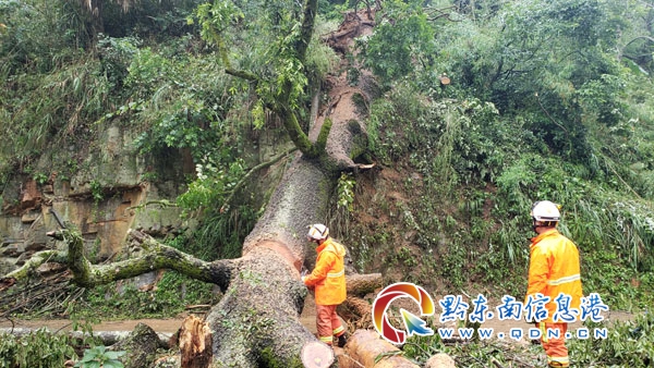 本網訊 5月29日12時57分,天柱縣消防大隊接到群眾報警稱,天柱縣石洞鎮高敏村圭雅組,由于近日連續狂風暴雨導致一顆古樹“連根拔起”倒在路邊,幾百噸的樹干將高敏村通往外界的主要道路堵截得嚴嚴實實。接到報警后,天柱縣消防大隊立即出動一個救援小組前往處置。