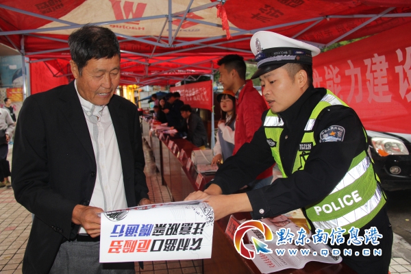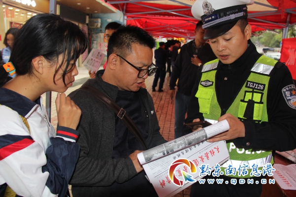 活動中,縣交警大隊民警通過懸掛交通事故典型案例橫幅,發放交通安全宣傳資料,面對面解答群眾咨詢,講授交通事故防范安全措施,以提高群眾防災減災意識,減少道路交通事故造成的人為災害。(龍仲涌)