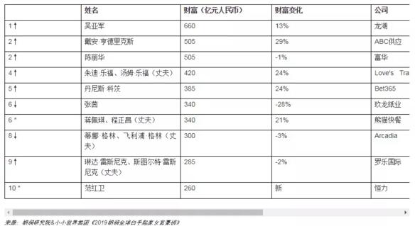 3月7日,《2019胡潤全球白手起家女富豪榜》發布,來自16個國家的89位白手起家十億美金女富豪上榜,比去年減少13位。