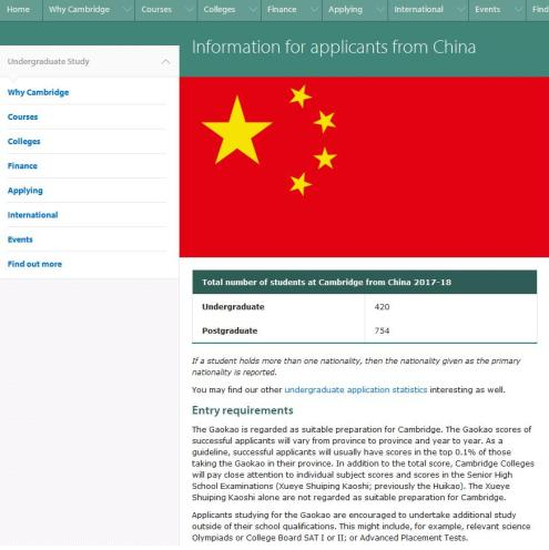 劍橋官網顯示,截止2017年-2018年,共有420名中國學生在劍橋大學就讀本科,共計754名中國學生在劍橋大學讀碩士。