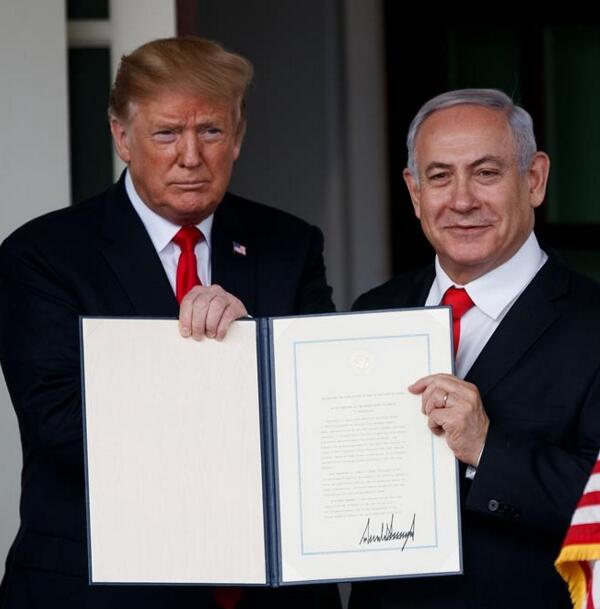 特朗普當天在白宮與到訪的以色列總理內塔尼亞胡舉行會談,并簽署公告正式承認以色列對戈蘭高地的主權。公告稱,美方這一決定是因為伊朗和真主黨等組織在敘利亞南部采取行動,試圖把戈蘭高地變成對以色列發動襲擊的場所。
