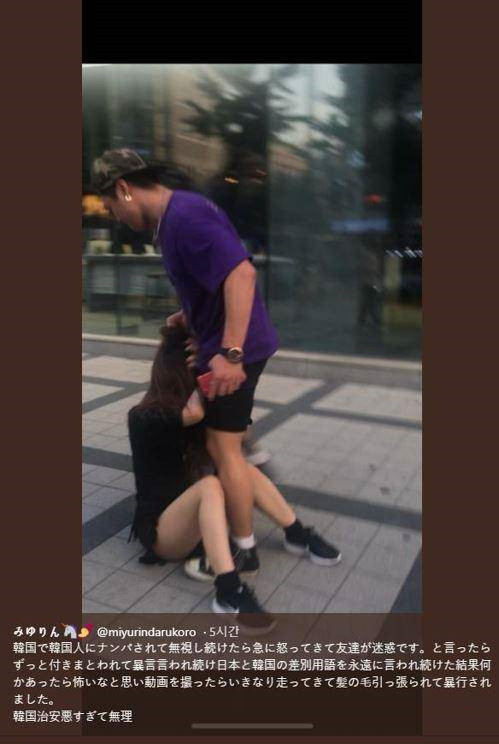 照片上,一名身穿紫色上衣和黑色短褲、腿上有紋身的韓國男子拽住日本女游客的頭發,并將其摔倒后,進行毆打。