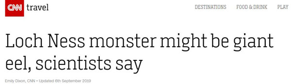尼斯湖水怪之謎要被揭曉了?據美國有線電視新聞網(CNN)報道,新西蘭奧塔哥大學遺傳學家尼爾·格默爾5日公開最新研究結果,對尼斯湖“水怪”作出了新解釋:它可能是一條巨型鰻魚。