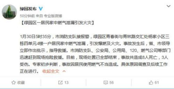 專家初步判斷,事故因居民使用燃氣不當造成。具體原因調查及后續工作正在進行。