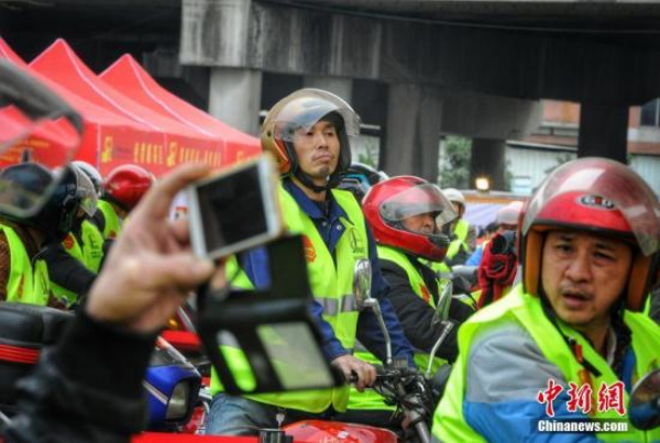 2019春運(yùn)首日 鐵騎大軍帶“滿愛”踏上回家路。中新網(wǎng)記者 李霈韻 攝