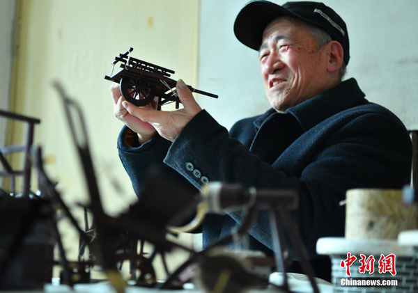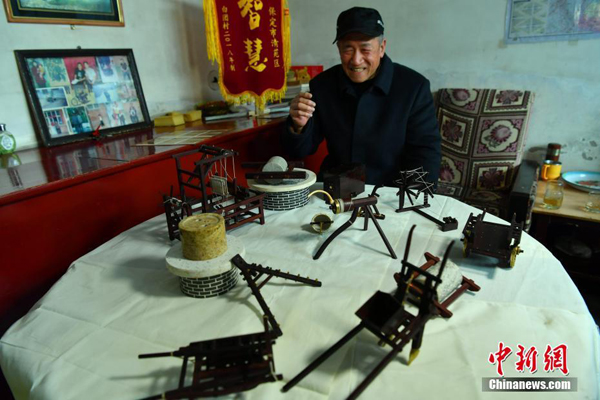 2月25日,河北保定白團北街村村民王香成正在展示并介紹他手工打造的“微縮版”農村農耕老物件。據老人介紹,他按照1:8的比例打造出犁、風箱、馬車、紡車、織布機、石磨、轆轤、石碾子、耙等十幾套老物件,希望給子孫留點‘鄉愁’,留點念想,留點紀念。中新社記者翟羽佳攝