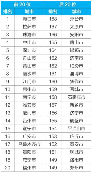前20位和后20位城市名單