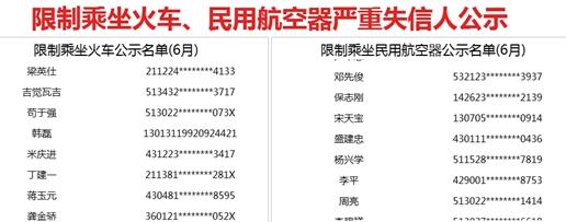 此外,6月新增限制乘坐火車嚴重失信人524人,限制乘坐民用航空器嚴重失信人871人。