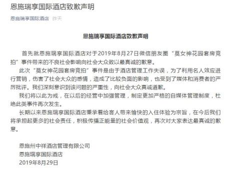 涉事酒店辯稱,“莫女神花園套房競拍”事件是由于酒店管理工作失誤,為了利用名人效應(yīng)進(jìn)行營銷,傷害了社會(huì)大眾的感情,造成了比較負(fù)面的影響,因此將以此為戒,杜絕此類事件再次發(fā)生。