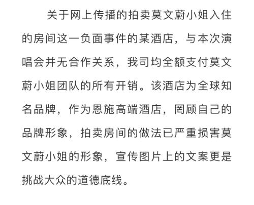 對于酒店的行為,承辦此次莫文蔚演唱會(huì)的湖北壹天橙文化傳媒有限公司聲明稱,該酒店與本次演唱會(huì)并無合作關(guān)系,并斥責(zé)酒店方拍賣房間的做法“嚴(yán)重?fù)p害莫文蔚形象,宣傳圖片上的文案更是挑戰(zhàn)大眾的道德底線”。