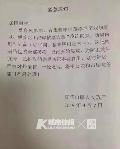 受臺風影響,有集裝箱掉落漂浮至普陀山海域,目前普陀山沿岸散落大量“冷凍肉類、動物內臟”制品(以牛肉、豬雞鴨內臟為主)。這批肉制品包裝全部破損,已經開始腐敗,為防止發生疫情,已拾取的居民切記不要食用,及時銷毀,嚴禁對外銷售,一經發現,將由公安和市場監管部門嚴肅處理。