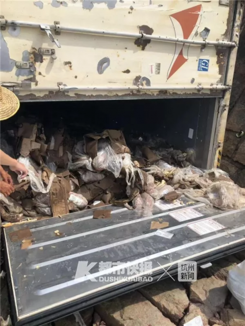 普陀山鎮組織各方力量對發現的集裝箱里存留的肉制品進行緊急處置,將它們用編織袋分裝,用大型封閉式垃圾車裝運到死亡廢棄動物專業處理公司進行集中焚燒。