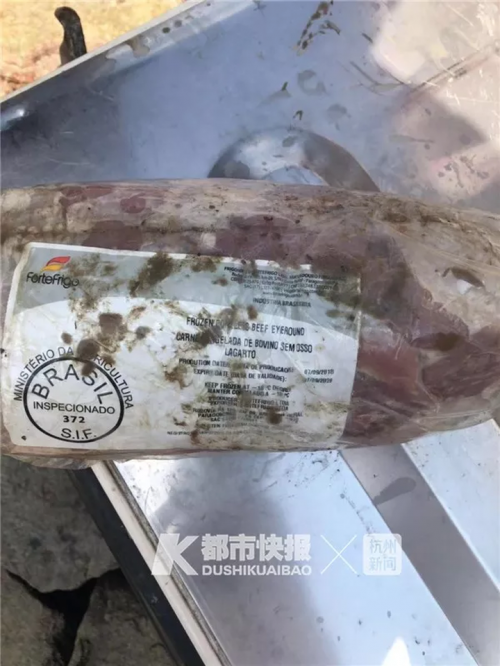 “透過集裝箱箱體看進去,里面還剩三分之一左右的肉,全都浸泡在海水中。”范凱華說,肉是散裝的,是一塊塊的凍腱子肉,一塊大約三四斤,用保鮮膜簡易包裝著,上面是外文,沒有生產日期、廠名等等。其中,靠近集裝箱門口的肉基本上都已經變質,一股臭味撲鼻而來。