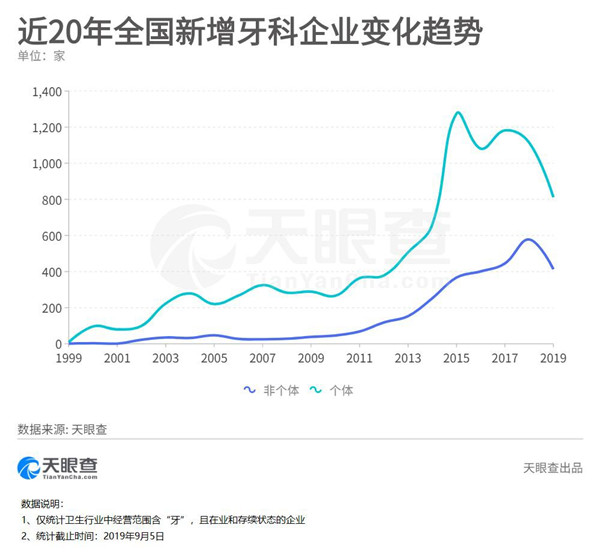 天眼查數據顯示,近二十年來,我國共新增12905家牙科企業(yè),且每年新注冊的牙科企業(yè)數持續(xù)增長。2015-2019年,每年新增牙科企業(yè)均超過1000家,呈井噴式發(fā)展,其中2015年新增的牙科企業(yè)數接近2014年的兩倍。