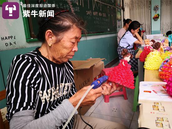 9月26日上午,在徐州特教學(xué)校盲部教室內(nèi),70歲的劉瑞俠獨(dú)自坐在角落里,她一手拿著一個(gè)精致的玩偶,一手操作打膠筆,幾番擺弄后,玩偶的五官都變得生動(dòng)起來(lái)。每天的大部分時(shí)間里,老人都會(huì)在教室內(nèi)做手工,她會(huì)時(shí)不時(shí)停下手里的活,聽(tīng)一聽(tīng)隔壁教室孩子們的誦讀聲音——她在判斷哪個(gè)聲音是12歲的孫子鑫鑫的。
