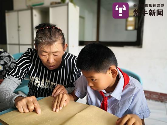 老人給孫子鑫鑫輔導(dǎo)盲文