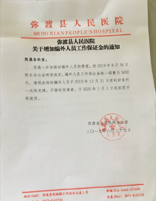 彌渡縣人民醫(yī)院關(guān)于增加編外人員工作保證金的通知