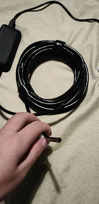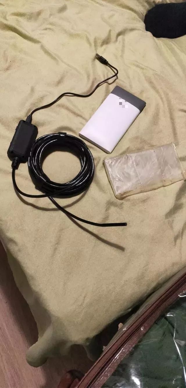 張先生拍下的現場照片顯示,一團黑色圈起的線末端有一個針孔探頭,旁邊有一個充電寶。