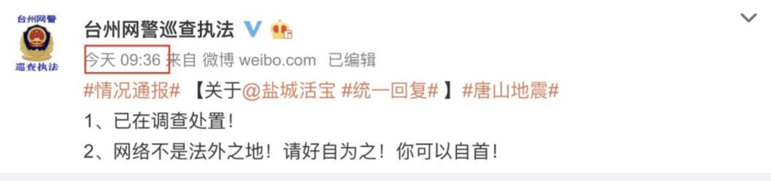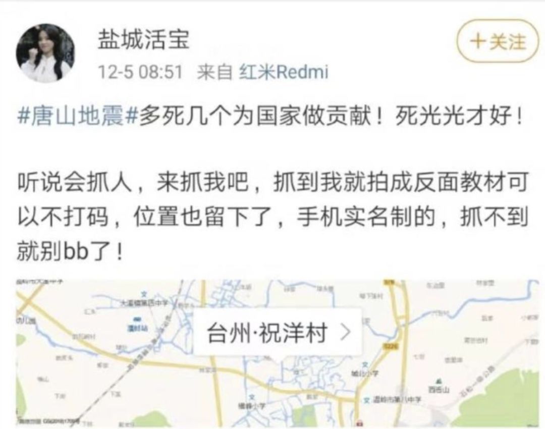 據報道,在地震發生后,一位名為“鹽城活寶”的網友,在微博發布涉唐山豐南地震不當言論,并表示“抓到我就拍成反面教材,可以不打碼”,并留下了具體位置。