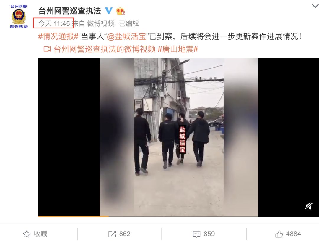 也就是說,從警方開始調查,到嫌疑人到案,總共花了2個多小時!警方還發出了@鹽城活寶 到案時的視頻: