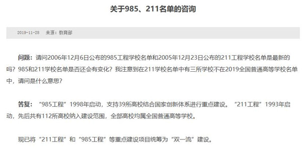 此外,在今年3月的全國(guó)政協(xié)十三屆二次會(huì)議中,有委員建議,在老少邊地區(qū)增設(shè)教育部直屬高校,加快教育精準(zhǔn)扶貧步伐。近日教育部回復(fù)稱(chēng),“目前不宜擴(kuò)大中央部門(mén)直屬高校規(guī)模”。因此,985、211高校名單也暫不會(huì)有變化。