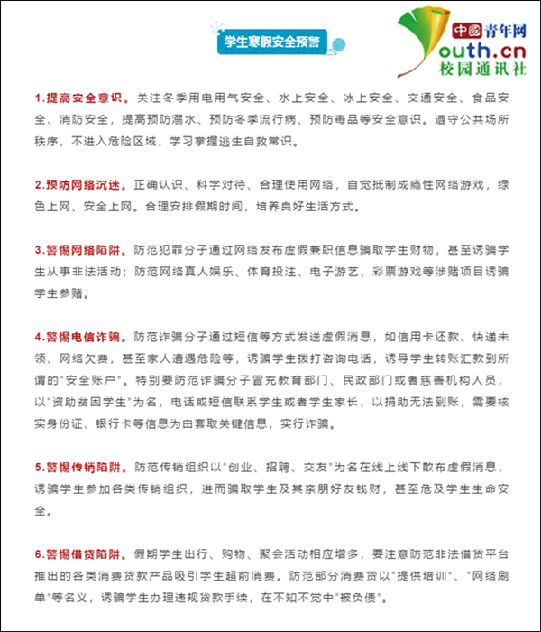 在排行榜最后,還發布了“學生寒假安全預警”注意事項,提醒大學生提高安全意識、預防網絡沉迷、警惕網絡陷阱、警惕電信詐騙、警惕傳銷陷阱、警惕借貸陷阱等。