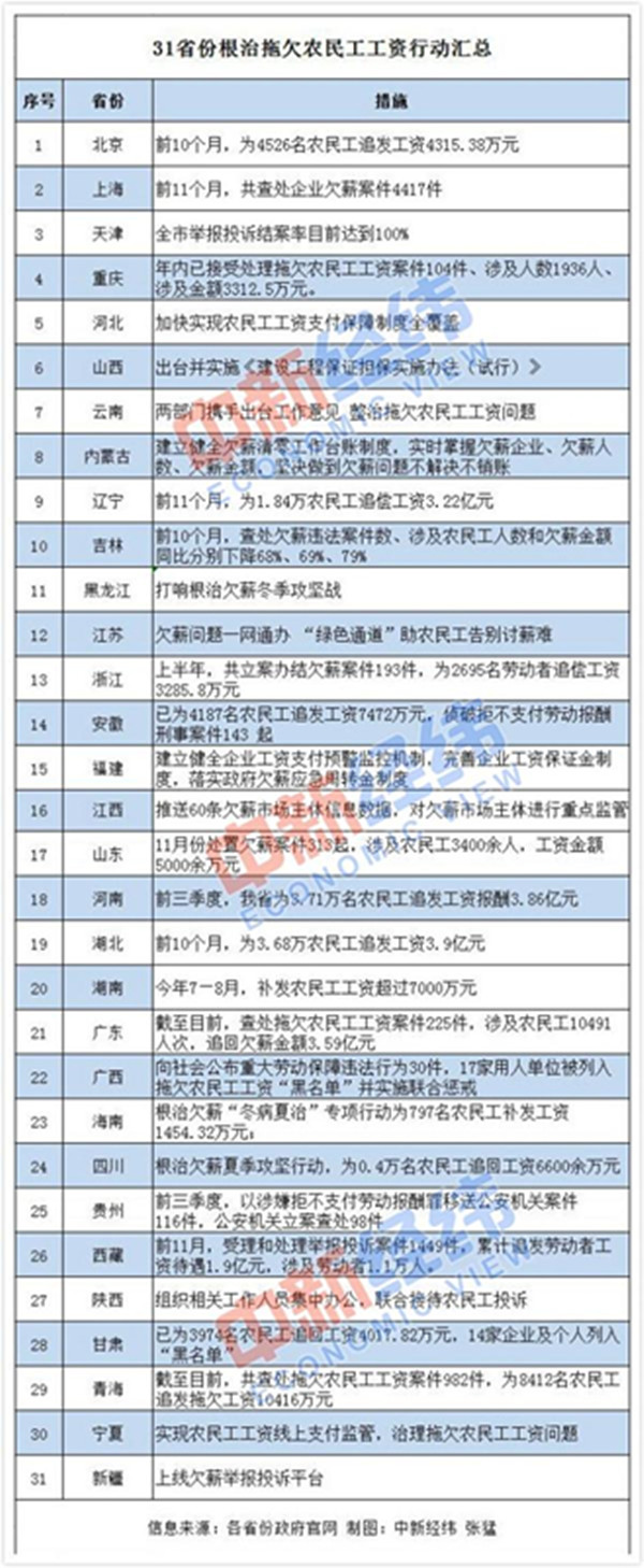 北京、天津、河南、廣西、山西、江西等多省份通過(guò)“黑名單”管理、欠薪入罪等手段,依法打擊欠薪違法行為,構(gòu)筑“一處失信、處處受限”的聯(lián)合懲戒大格局,以增加欠薪企業(yè)和個(gè)人的違法違規(guī)成本,從源頭形成震懾力。