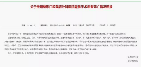 2019年1月3日下午,貴州整形口腔美容外科醫(yī)院(即利美康醫(yī)院,民營(yíng))一名患者做隆鼻手術(shù)死亡。我們對(duì)于患者的遭遇深表同情,對(duì)于家屬的訴求深表關(guān)切。