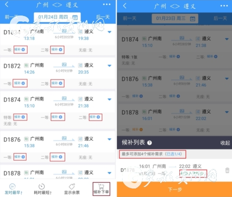 點擊“候補”字樣,系統會將該需求自動加入當前候補購票需求列表。每位用戶可提交1個候補訂單,1個訂單中可添加發到站相同(可以是同城的不同車站)的2個相鄰的乘車日期,每個乘車日期可添加2個不同“車次+席別”的組合需求,共可添加4個需求。