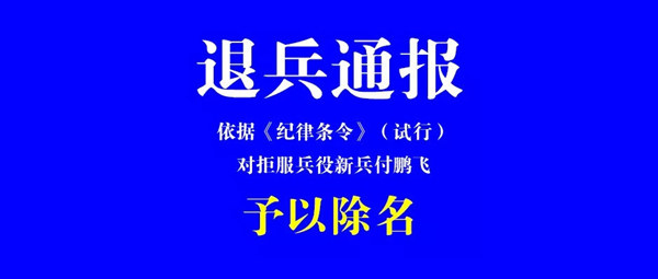 付鵬飛,男,1999年11月21日出生,身份證號:52263019991121XXXX,臺江縣南宮鎮擁黨村人,中職學歷。2018年8月自愿報名參軍,通過體檢、政審、役前訓練等征兵程序后到四川廣元武警中隊服役,役前訓練期間,本人已簽訂《依法服兵役承諾書》。入伍后,付鵬飛怕苦怕累,不愿受部隊紀律約束,以種種理由拒服兵役。縣征兵辦、南宮鎮領導及其家屬先后4次前往付鵬飛所在部隊,與本人進行耐心談話,做教育引導工作,并積極和所在部隊大隊長、指導員、排長、班長等共同做其思想工作,但付鵬飛思想始終未得到轉化,仍然拒絕服兵役,2018年11月30日,依據《中國人民解放軍紀律條令》(試行),經武警四川省總隊黨委研究,決定對付鵬飛作除名處理,并于2018年12月6日送回我縣。