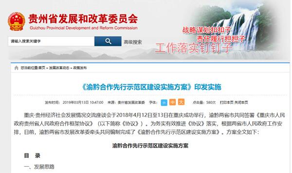 近日,重慶市發展改革委、貴州省發展改革委共同編制的《渝黔合作先行示范區建設實施方案》(以下簡稱《方案》)在省發改委網站正式發布。這是繼2018年4月,兩省市共同簽署《重慶市人民政府貴州省人民政府合作框架協議》后,聯手推進渝黔合作的又一重大舉措。