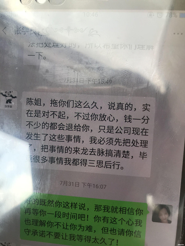 7月31日,公司法人張某某還表達(dá)了歉意:“陳姐,拖你們這么久,說真的,實(shí)在是對(duì)不起,不過你放心,錢一分不少的都會(huì)退給你……”