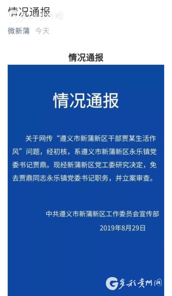 關于網傳“遵義市新蒲新區干部賈某生活作風”問題,經初核,系遵義市新蒲新區永樂鎮黨委書記賈鼎。現經新蒲新區黨工委研究決定,免去賈鼎同志永樂鎮黨委書記職務,并立案審查。落款為中共遵義市新蒲區工作委員會宣傳部。
