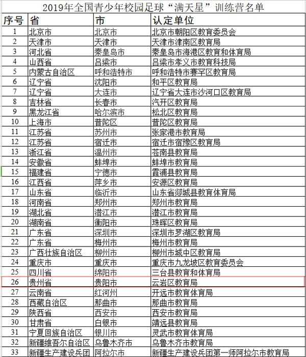 據了解,為全面貫徹落實全國教育大會精神,深入落實《中國足球改革發展總體方案》《教育部等6部門關于加快發展青少年校園足球的實施意見》,扎實推進校園足球“八大體系”建設,在有關單位自主申報、各級教育行政部門審核推薦的基礎上,教育部組織專家對各地推薦的特色學校、試點縣區和“滿天星”訓練營進行了綜合認定。最終,認定并命名2019年全國青少年校園足球特色學校2933所、全國青少年校園足球試點縣(區)25個和全國青少年校園足球“滿天星”訓練營33個。