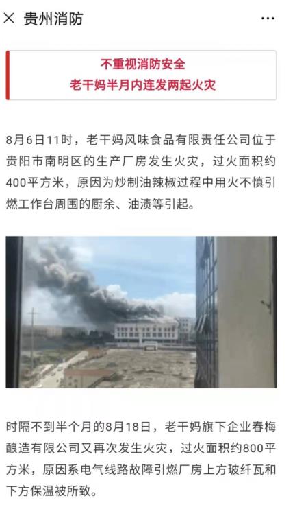 該文章指出,因不重視消防安全,老干媽半月內連發兩起火災。