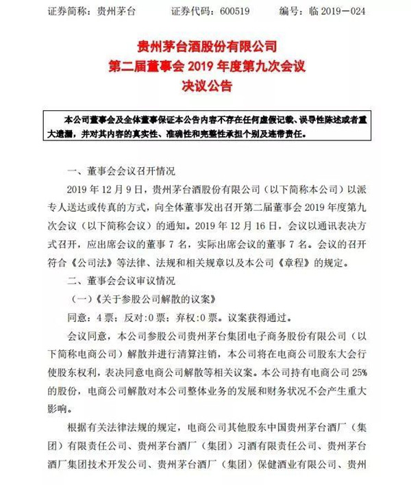 根據天眼查顯示,茅臺集團、茅臺股份公司、貴州凱瑞乾濟科技有限公司為茅臺電商三大股東,持股比例分別為 35%、25%、34%。目前核心團隊只顯示為茅臺云商工作組組長的陳華。旗下主要產品為茅臺云商和 e 茅臺,證券時報 e 公司記者從茅臺了解到,電商公司解散將不能再在茅臺云商上購酒,不過在天貓等平臺依然可以。