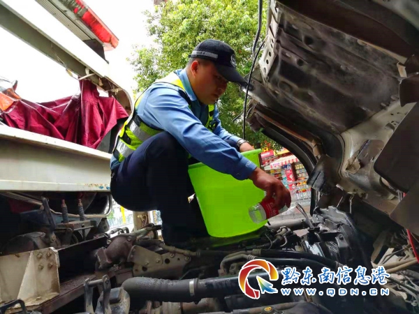 鎮(zhèn)遠(yuǎn)交警創(chuàng)建5A的拖車連續(xù)工作時(shí)間長,開鍋了,交警在加水