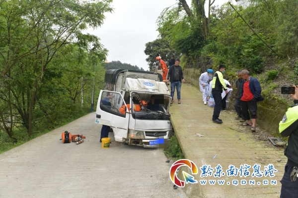救援人員到達事故現場后發現,一輛貨車撞上了斜坡一側的堡坎,車頭嚴重變形,擋風玻璃完全破碎,駕駛員被困駕駛室且雙腿被卡住無法動彈。情況緊急,救援人員首先利用搶險救援車將事故車輛牽引出來加大救援空間,隨后,采用液壓頂桿擴大施救范圍,并逐步將被困人員雙腿拉出。經過救援人員近30分鐘的努力,被困人員被成功救出。