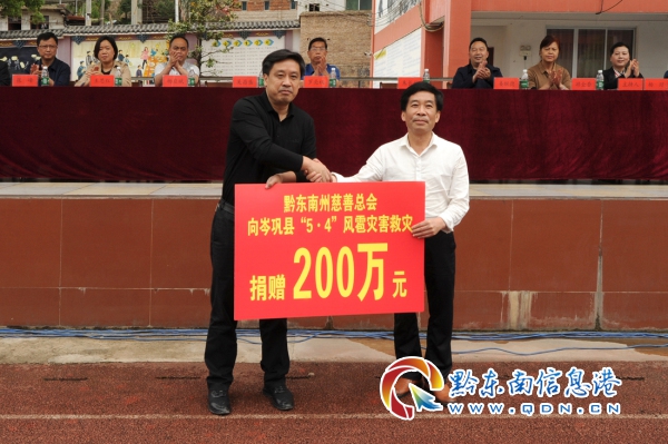 黔東南州民政局黨組書記、局長、州慈善總會常務(wù)副會長、秘書長朱長林向岑鞏縣愛心捐贈救災(zāi)救助善款200萬元,岑鞏縣縣長吳昌盛接受捐贈。