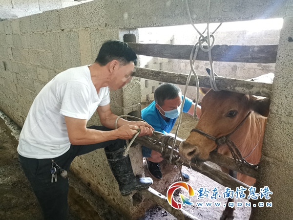 (岑鞏縣動物疫病預防控制中心技術人員對涉案牛進行血痕采樣)