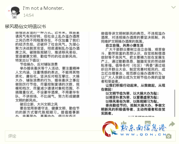 崇尚禮儀是中華民族的優良傳統,宴請客人是我國的傳統習俗,是親友間溝通情感增進友誼的一種方式。為凝心聚力決戰脫貧攻堅,徹底遏制亂辦濫辦酒席之風,破除陳規陋習,推進移風易俗,營造健康文明、勤儉節約的社會新風尚,特發出倡議,主要是節儉操辦、反對鋪場浪費;破舊立新、大興文明之風;干部帶頭,做好現金表率;自立自強,共奔小康生活。