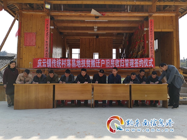 本著自愿、公正、平等的原則,此次簽約儀式,有10戶傳統村落易地扶貧搬遷戶簽訂《從江縣慶云鎮易地扶貧搬遷戶舊房收歸管理協議》。根據貴州省易地扶貧搬遷政策要求,乙方搬遷入住安置點新房后,原居住地的舊房可不拆除,乙方代表全家簽訂本協議后舊房無償收歸,甲方統籌作為公共資產進行管理和處置。