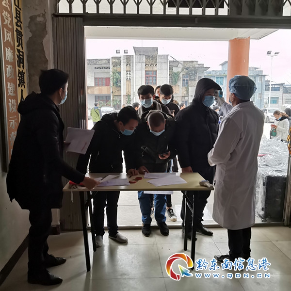 貫洞鎮(zhèn)工作人員為務(wù)工人員測(cè)量體溫