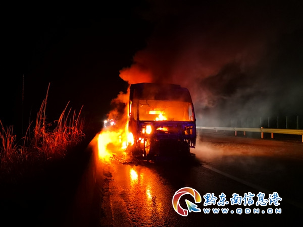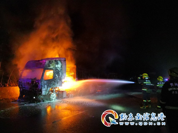 救援人員到達現場后發現,車身大部分處于燃燒狀態。根據現場情況,救援人員立即對火勢展開撲救,由于該貨車油箱已經燒損,現場指戰員只能采用泡沫覆蓋式滅火,在將油箱位置的火撲滅后,利用水槍對車身的其他位置的余火進行了全面清理。經過救援人員近30分鐘的緊張撲救,火勢被完全撲滅。